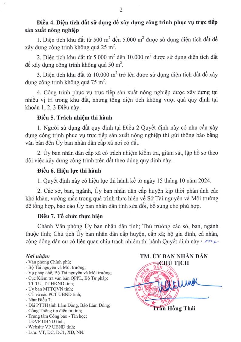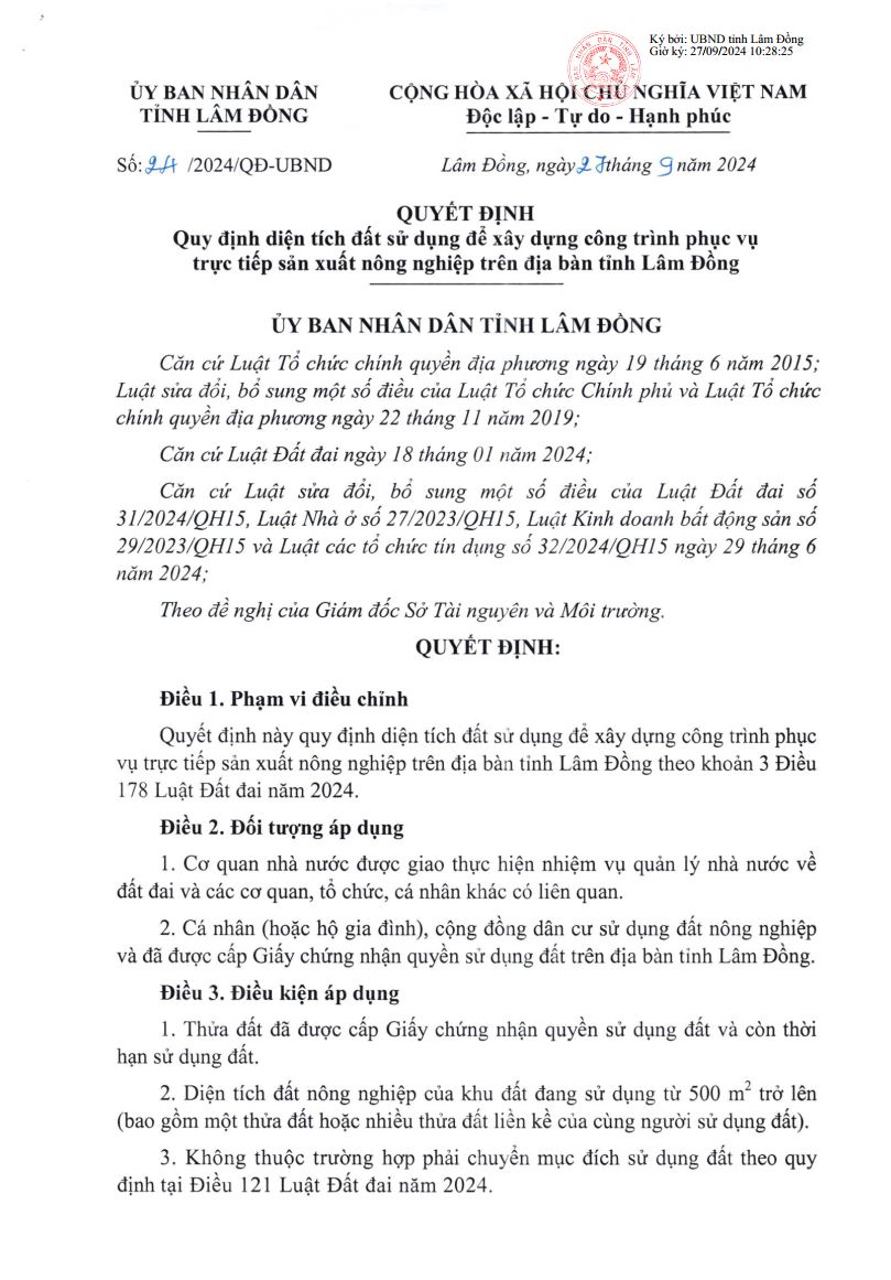 Căn cứ QĐ số 24/ 2024/ QĐ – UBND ký ngày 27/ 9/ 2024 Quyết định diện tích sử dụng để xây dựng công trình phục vụ sản xuất nông nghiệp trên địa bàn tỉnh Lâm Đồng như sau: